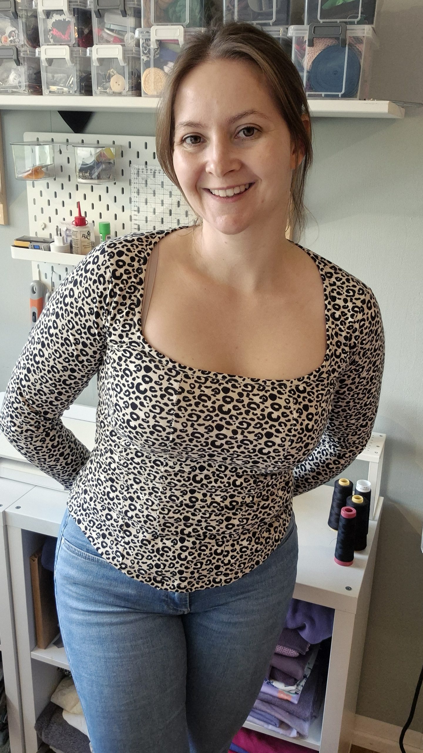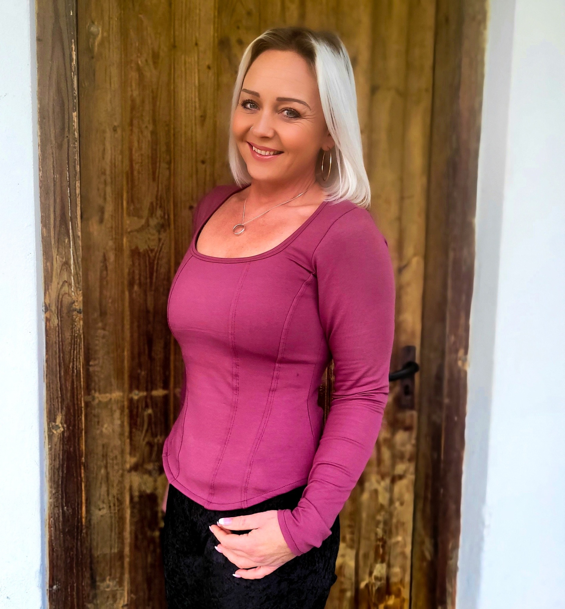 Die Schnittkonstruktion orientiert sich an einer corsageähnlichen Linienführung, die den Körper gezielt formt und gleichzeitig Bewegungsfreiheit lässt. So entsteht ein figurbetontes Shirt, in dem man sich sicher fühlt und garantiert gut aussieht, unabhängig von Konfektionsgröße oder Tagesform.